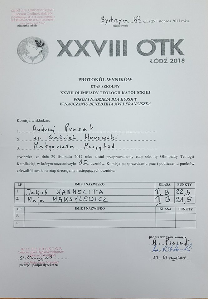 ETAP SZKOLNY XXVIII OLIMPIADY TEOLOGII KATOLICKIEJ W dniu 29 listopada odbył się etap szkolny XXVIII Olimpiady Teologii Katolickiej, w którym uczestniczyło 10 uczniów. Do następnego etapu zakwalifikowali się: – Jakub Karmelita (II b) – Maja Maksylewicz (II b) Gratulujemy!