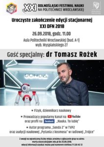 w uroczystym zakończeniu edycji stacjonarnej XXI DFN 2018 we Wrocławiu. Gościem specjalnym był dr Tomasz Rożek-fizyk, dziennikarz, autor programu telewizyjnego ,,Sonda 2’’oraz audycji naukowej ,, Pytania z kosmosu’’ w radiowej ,,Trójce’’.