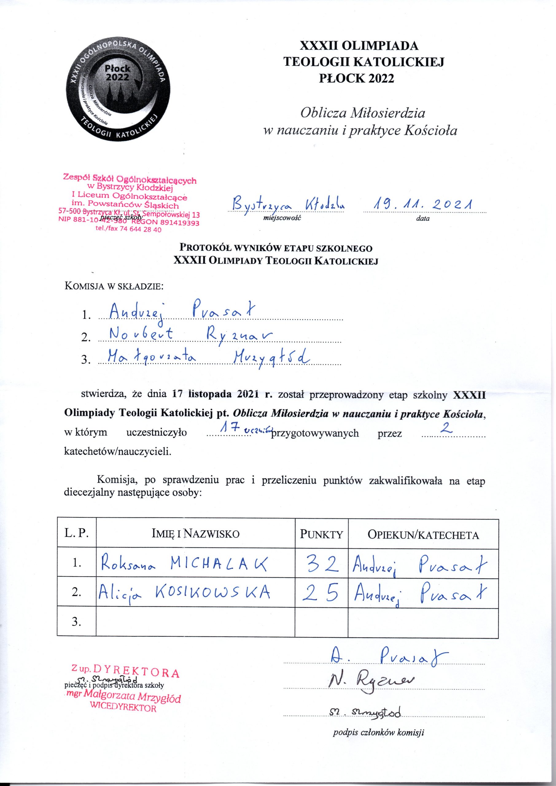 Olimpiada Teologiczna W ubiegłą środę odbył się etap szkolny Olimpiady Teologicznej, w którym wzięło udział 17 uczniów liceum. Do kolejnego etapu zakwalifikowały się: Roksana Michalak i Alicja Kosikowska (obie z kl. III B). Gratulujemy i życzymy dalszych sukcesów!
