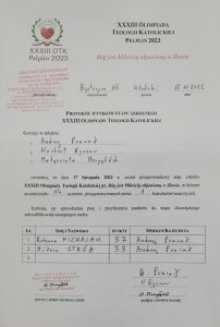 W czwartek 17 listopada odbyły się szkolne eliminacje XXXIII Olimpiady Teologii Katolickiej, w których uczestniczyło 14 uczniów naszego liceum. Do następnego etapu zakwalifikowali się: Roksana Michalak z kl. IV B i Miłosz Stróż z kl. II A. Gratulujemy!