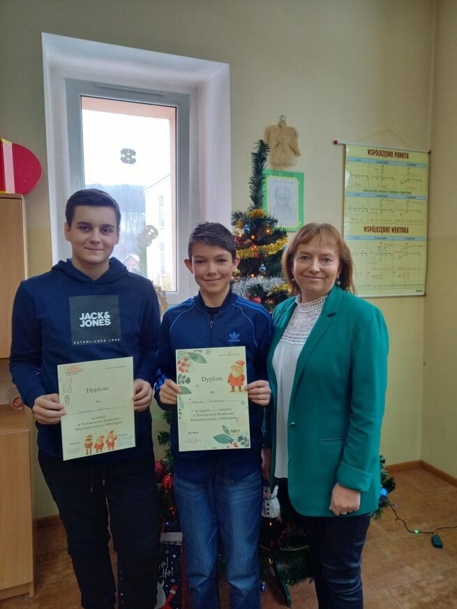 Dnia 6.12.2023 w Lądku Zdroju odbył się Powiatowy Konkurs Matematyczny z Mikołajem. W konkursie wzięli udział uczniowie z klas siódmych ze szkół z Pławnicy, Wambierzyc, Radkowa, Żelazna, Lądka Zdroju i Bystrzycy Kłodzkiej. Nasz uczeń z SP1 w Bystrzycy Kłodzkiej- Łukasz Stankiewicz zdobył I miejsce i wygrał tablet. Szymon Kubat zajął miejsce IV. Nauczyciel uczący Sylwia Pierzchała-Ryznar. Gratulacje!!!